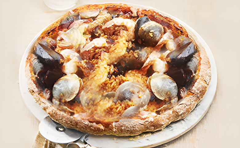 To make an Ai Frutti Di Mare pizza, start with freshly made pizza dough as your canvas. Add tomato sauce. My favorite recipe is a simple San Marzano tomato sauce made by adding salt and pepper to hand-mushed tomatoes. Do not pre-cook the sauce, as it will cook in your wood fired pizza oven. Add the sauce, cheese and your freshly cooked Ai Frutti Di Mare and voila! You have made a delicious Ai Frutti Di Mare pizza right in your own home.